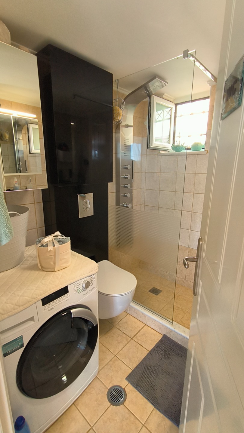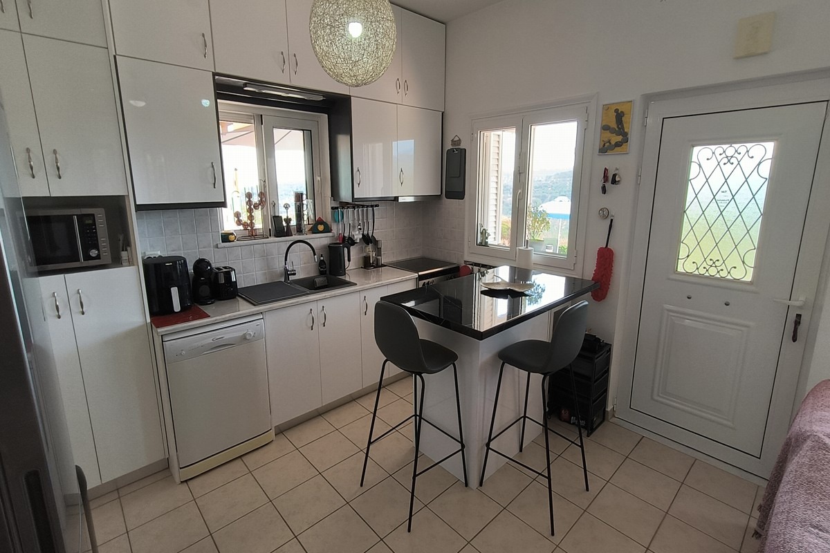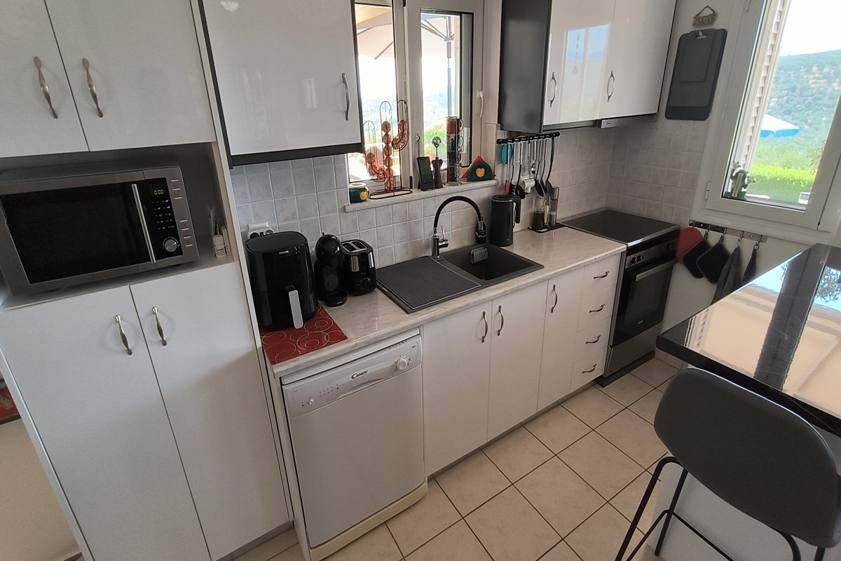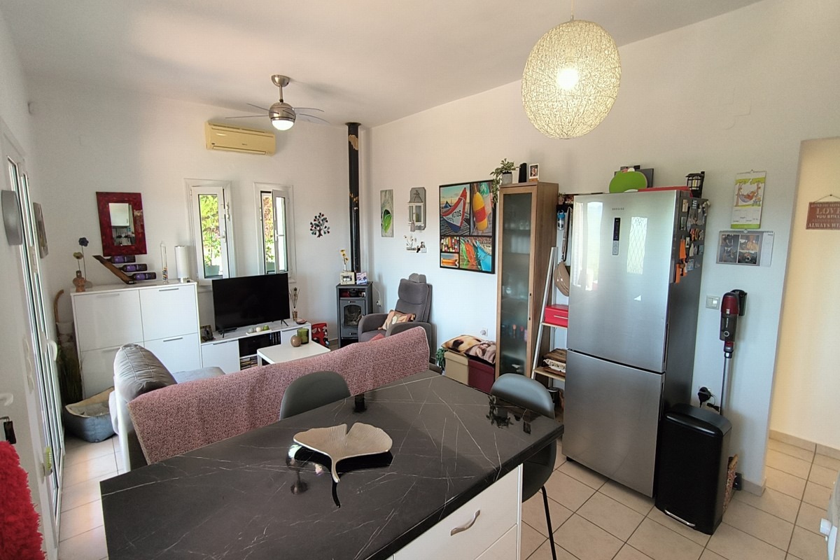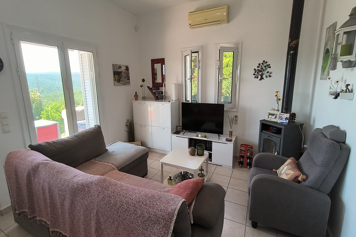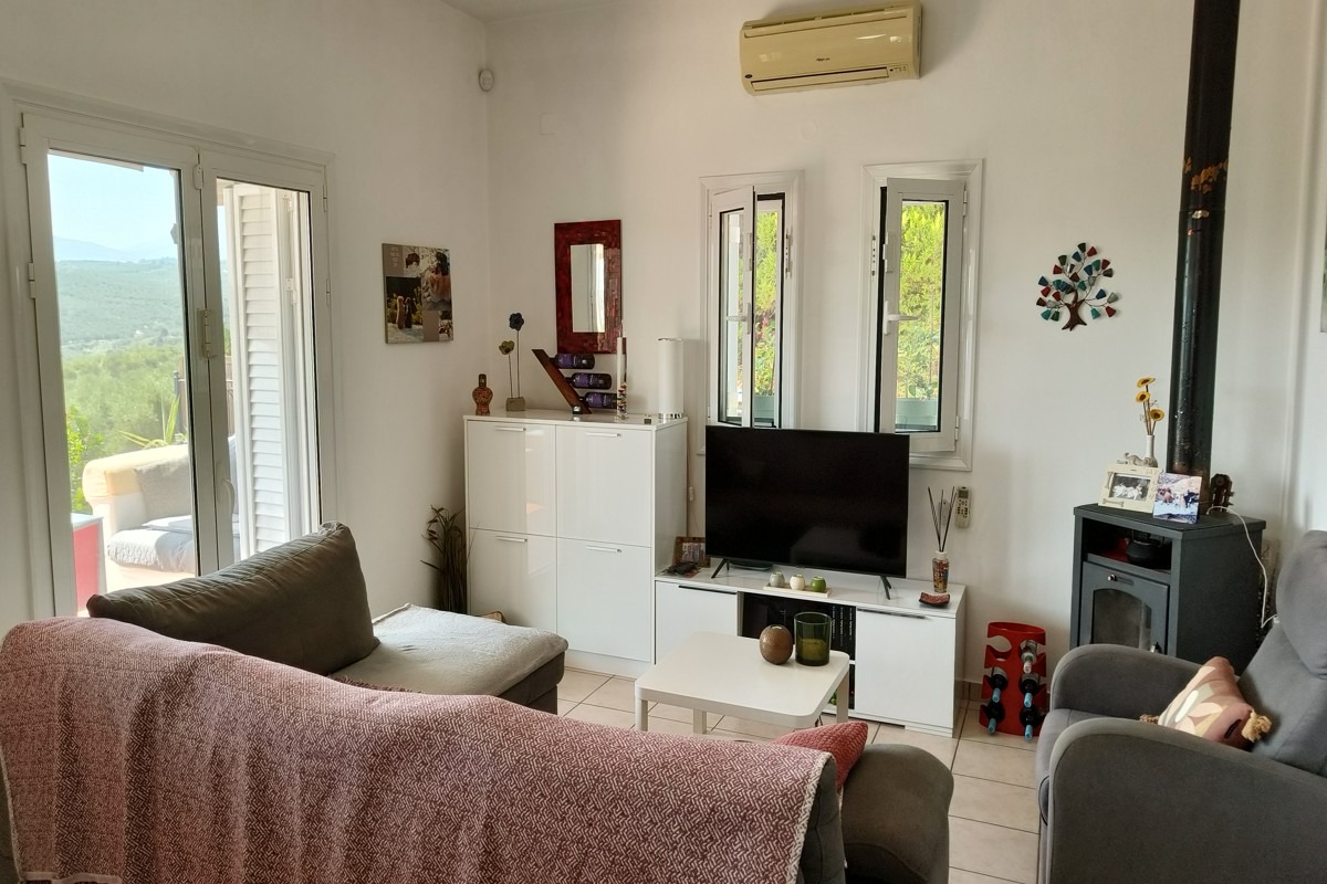 Στο εσωτερικό, το σπίτι προσφέρει πλήρως επιπλωμένη κουζίνα και σαλόνι με ξυλόσομπα, δύο υπνοδωμάτια με εντοιχισμένες ντουλάπες και δύο μπάνια, έτοιμο για άμεση κατοίκηση. Η κατοικία είναι ιδανική τόσο για μόνιμη διαμονή όσο και για επένδυση ή εξοχική χρήση.